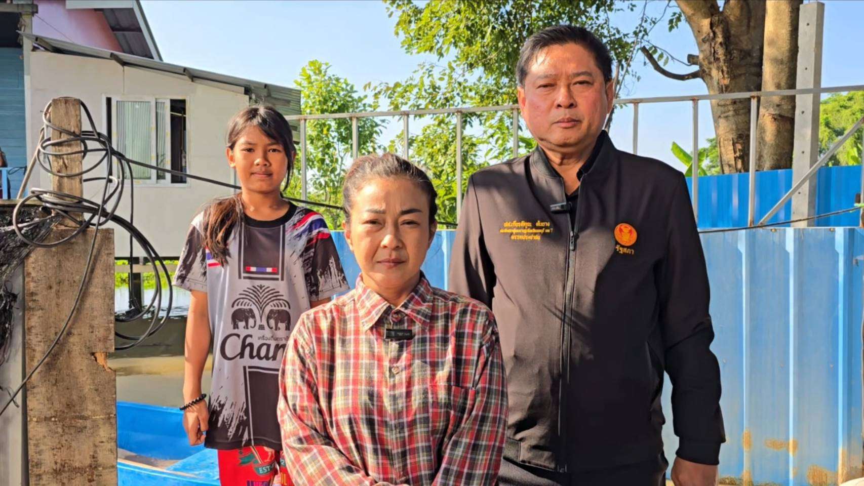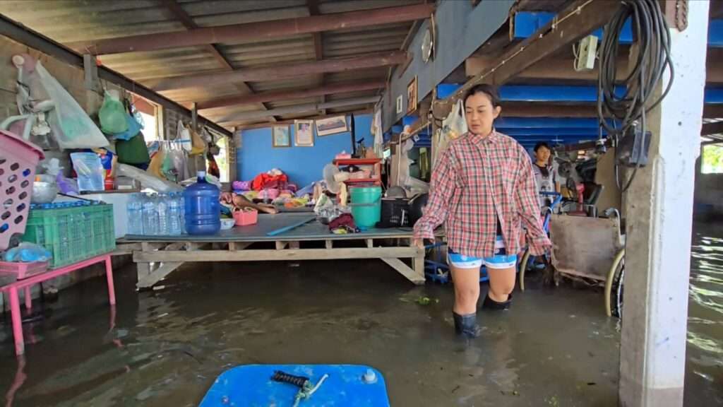 น.ส.รัตนพชร เจ้าของบ้าน กล่าวว่า บ้านของตนอาศัยอยู่ 4-5 คน มีผู้ใหญ่ 3 คน เด็ก 1 คน และพ่อของตนซึ่งเป็นผู้ป่วยติดเตียง 1 คน ถูกน้ำท่วมมาเป็นเดือนแล้ว เพราะบล็อครอบๆบ้านไว้รองรับน้ำ หากปล่อยน้ำไปก็จะไปท่วมสวนผักชาวบ้านเสียหาย และตนกับครอบครัวก็จะออกไปไหนไม่ได้เพราะน้ำท่วมหมด ทุกวันนี้ต้องใช้ชีวิตเดินเข้า-ออก ลุยน้ำทุกวัน ส่วนเรือมีให้ลูกสาวไปโรงเรียน บริเวณรอบๆบ้านมีน้ำเยอะ สูงเกือบถึงหัวเข่าต้องสวมรองเท้าบูทเดินเพราะปลิงเยอะ ปกติทุกๆ 3 เดือน พ่อตนจะต้องไปหาหมอที่โรงพยาบาล แต่ช่วงนี้ต้องงดไปก่อนเพราะเดินทางลำบาก วีลแชร์ก็จมน้ำ วันนี้ดีใจที่สส.ทนายโป้ง เข้ามาช่วยเหลือ เนื่องจากตนร้องขอเรื่องสะพานไม้ไว้เดินเข้า-ออก ตอนนี้อยากให้หน่วยงานที่เกี่ยวข้องเข้ามาช่วยสูบน้ำออก และช่วยเหลือเรื่องน้ำประปา ก่อนหน้านี้ที่บ้านตนใช้น้ำบาดาลแต่พอยกเลิกไปก็ยังไม่สามารถขอน้ำประปาได้ ต้องอาศัยซื้อน้ำจากชาวบ้านเป็นยูนิตมาใช้ เดือดร้อนมาหลายปีแล้ว ครอบครัวตนเคยใช้น้ำคลองแล้วเป็นแผลติดเชื้อจนต้องไปนอนโรงพยาบาล ทุกวันนี้เลยจำใจซื้อน้ำจากชาวบ้านมาใช้แทน