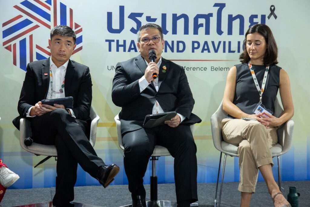 โดย Thailand Pavilion มีเวทีเสวนาหลากหลายประเด็น โดยนายปวิช เกศววงศ์ รองอธิบดีกรมการเปลี่ยนแปลงสภาพภูมิอากาศและสิ่งแวดล้อม และผู้ทรงคุณวุฒิหลากหลายสาขา ร่วมเสวนาแสดงถึงความสำคัญของป่าไม้เขตร้อนที่สำคัญต่อการบรรเทา และบรรลุเป้าหมายการปรับตัว ความมั่นคงทางน้ำที่สำคัญอย่างยิ่งต่อมวลมนุษยชาติ ระบบตลาดคาร์บอนในภูมิภาคอาเซียน ยึดหลักความโปร่งใสและความน่าเชื่อถือสูง เชื่อมโยงกับตลาดคาร์บอนระดับโลก ปิดท้ายด้วยการเข้าถึงแหล่งเงินทุนอย่างเป็นธรรมตัวช่วยสำคัญในการขับเคลื่อนนโยบายจากคำมั่นสัญญาสู่การลงมือปฏิบัติจริง