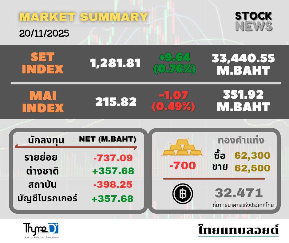 SET ปิดวันนี้ที่ 1,281.81 จุด เพิ่มขึ้น 9.64 จุด (+0.76%) มูลค่าซื้อขาย 33,440.55 ล้านบาท