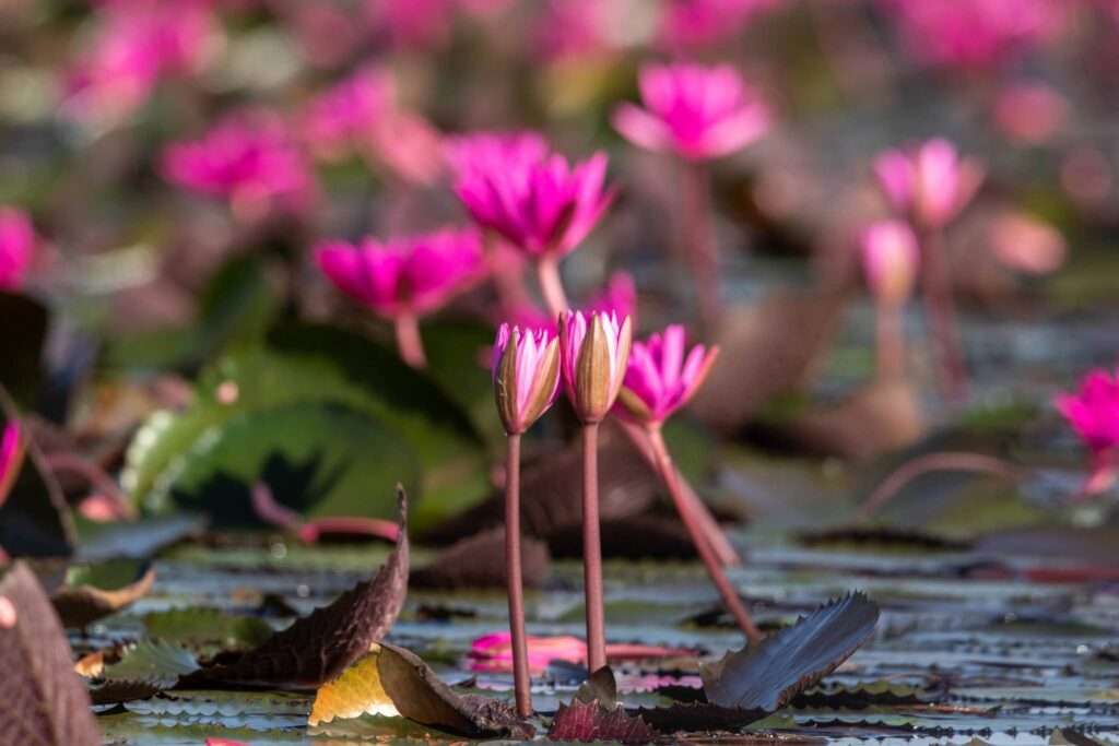 จากภาพที่เห็น ดอกบัวสีชมพูสดใสเหล่านี้ผลิบานเด่นเป็นประกายเหนือผืนน้ำและใบบัวสีเขียว กลีบบัวที่มีโทนสีชมพูสดถึงม่วงท่ามกลางใบบัวที่ลอยอยู่บนผิวน้ำอย่างหนาแน่น สร้างความประทับใจแก่ผู้ที่ได้มาพบเห็น