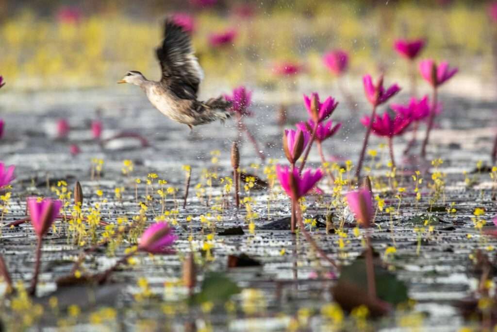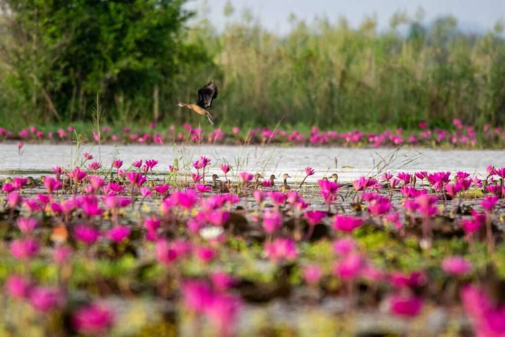 ดอกบัวสีชมพูนนับพันผลิบานทั่วบึงบอระเพ็ด จังหวัดนครสวรรค์ กลายเป็นทะเลบัวสุดอลังการรับลมหนาว นักท่องเที่ยวแห่ชมความงามยามเช้าขณะบัวบานเต็มที่ ท่ามกลางระบบนิเวศอุดมสมบูรณ์ของเขตห้ามล่าสัตว์ป่าแห่งนี้