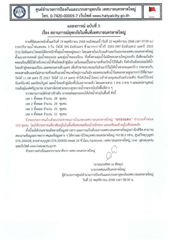 นายสิริพงศ์ กล่าวว่า ฝนที่ตกหนักตั้งแต่วันที่ 19 พฤศจิกายน จนถึงวันนี้ เวลา 07.00 น. รวมปริมาณน้ำฝนสะสม 3 วัน วัดได้ 595 มิลลิเมตร ซึ่งมากกว่าทั้งปี 2543 (497 มิลลิเมตร) และปี 2553 (516 มิลลิเมตร) โดยเขตเทศบาลนครหาดใหญ่ประกาศ “ยกธงแดง” จำนวนทั้งหมด 103 ชุมชน โดยให้ประชาชนที่อาศัยอยู่ในในพื้นที่อพยพเคลื่อนย้ายสิ่งของ และเตรียมเข้าอยู่ในที่ปลอดภัย พร้อมขอให้ประชาชนติดตามข้อมูลข่าวสาร และการแจ้งเตือนจากเทศบาลนครหาดใหญ่อย่างใกล้ชิด