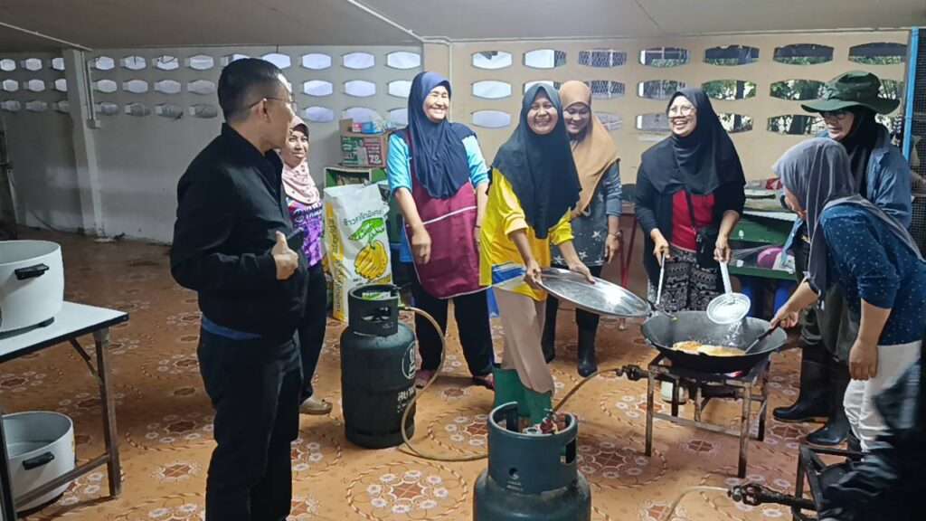 ปฏิบัติการครั้งนี้ได้เนรมิตพื้นที่ของ ศูนย์พัฒนาอาชีพ กลุ่มร่วมด้วยช่วยกันชายแดนใต้ ให้กลายเป็น “ฐานบัญชาการครัวสนาม” บรรยากาศภายในเต็มไปด้วยความขะมักเขม้นและไออุ่นจากเตาไฟ ท่ามกลางสายฝนที่โปรยปราย เจ้าหน้าที่และอาสาสมัครต่างระดมกำลังช่วยกันปรุงอาหารสดใหม่ เพื่อให้มั่นใจว่าพี่น้องผู้ประสบภัยจะได้รับประทานอาหารที่ร้อน ปรุงสุก และถูกสุขลักษณะ