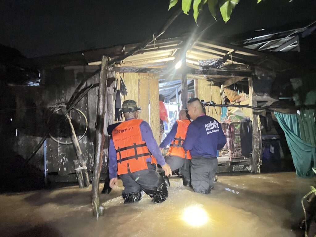 อำเภอตากใบ: น้ำท่วม 3 พื้นที่ ระดับน้ำสูงเฉลี่ย 70 เซนติเมตร ท่วมขังบริเวณที่ลุ่มต่ำ เจ้าหน้าที่ได้ช่วยขนย้ายสิ่งของขึ้นที่สูง พร้อมช่วยกรอกและขนกระสอบทรายเพื่อทำแนวกั้นน้ำลดผลกระทบต่อชุมชน