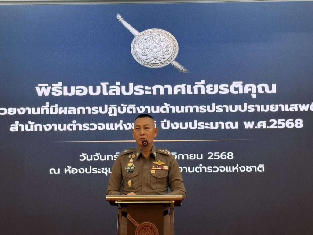 วันที่ 24 พฤศจิกายน 2568 พล.ต.อ.กิตติรัฐ พันธุ์เพ็ชร์ ผบ.ตร. เป็นประธานในพิธีมอบโลกประกาศเกียรติคุณแก่หน่วยงานที่มีผลการปฏิบัติงานด้านการปรับปรามยาเสพติดดีเด่น ของสำนักงานตำรวจแห่งชาติ ประจำปีงบประมาณ 2568 โดยมี พล.ต.ท.อาชยน ไกรทอง ผบช.ปส. พร้อมด้วย ผู้บังคับบัญชาที่รับผิดชอบงานด้านยาเสพติด เข้าร่วมอย่างคับคั่ง โดยมีผู้แทนจากหน่วยงานในระดับ กองบัญชาการ (บช.) ถึง สถานีตำรวจ (สน./สภ.) เข้ารับโล่ดังกล่าว ณ ห้องประชุมสารสิน ชั้น 2 อาคาร 1 สำนักงานตำรวจแห่งชาติ