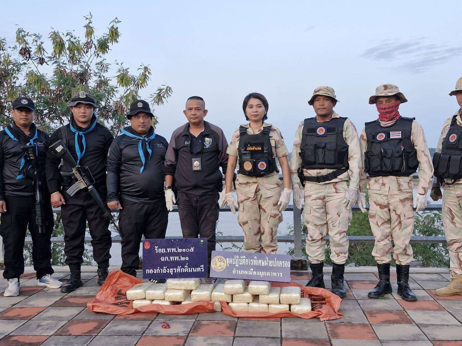 กระทั่งเวลา 17.30 น. ได้ตรวจพบเรือกีบหางยาวแล่นมาจากฝั่ง สาธารณรัฐประชาธิปไตยประชาชนลาว (สปป.ลาว) เข้ามายังฝั่งไทยแล้วโยนวัตถุต้องสงสัยทิ้งไว้บนฝั่ง ก่อนรีบแล่นเรือออกไป เจ้าหน้าที่ที่เฝ้าตรวจจึงทำการเฝ้าตรวจต่อไปอีก 2 ชั่วโมว แต่ไม่พบบุคคลมาแสดงตัวเป็นเจ้าของ จึงเข้าตรวจสอบวัตถุต้องสงสัยดังกล่าว พบยาเสพติดให้โทษประเภท 1 (ยาบ้า) จำนวน 2 กระสอบ จำนงนประมาณ 190,000 เม็ด (หนึ่งแสนเก้าหมื่นเม็ด) จึงได้นำของกลางมาไว้ที่ บก.ร้อย.ฉก.ทพ.2105 เพื่อตรวจนับของกลางโดยละเอียด และจะนำส่ง สภ.เมืองมุกดาหาร เพื่อดำเนินคดีตามกฎหมายต่อไป