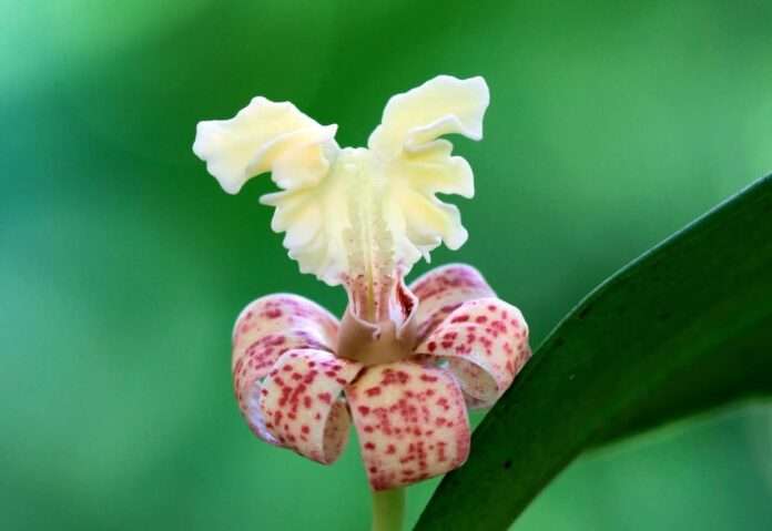เมื่อถึงฤดูดอกบานในช่วง กุมภาพันธ์–มิถุนายน ลำลูกกล้วยของมันจะผลิดอก 2–3 ดอก สีขาวครีมแต้มจุดน้ำตาลแดงอย่างอ่อนหวาน