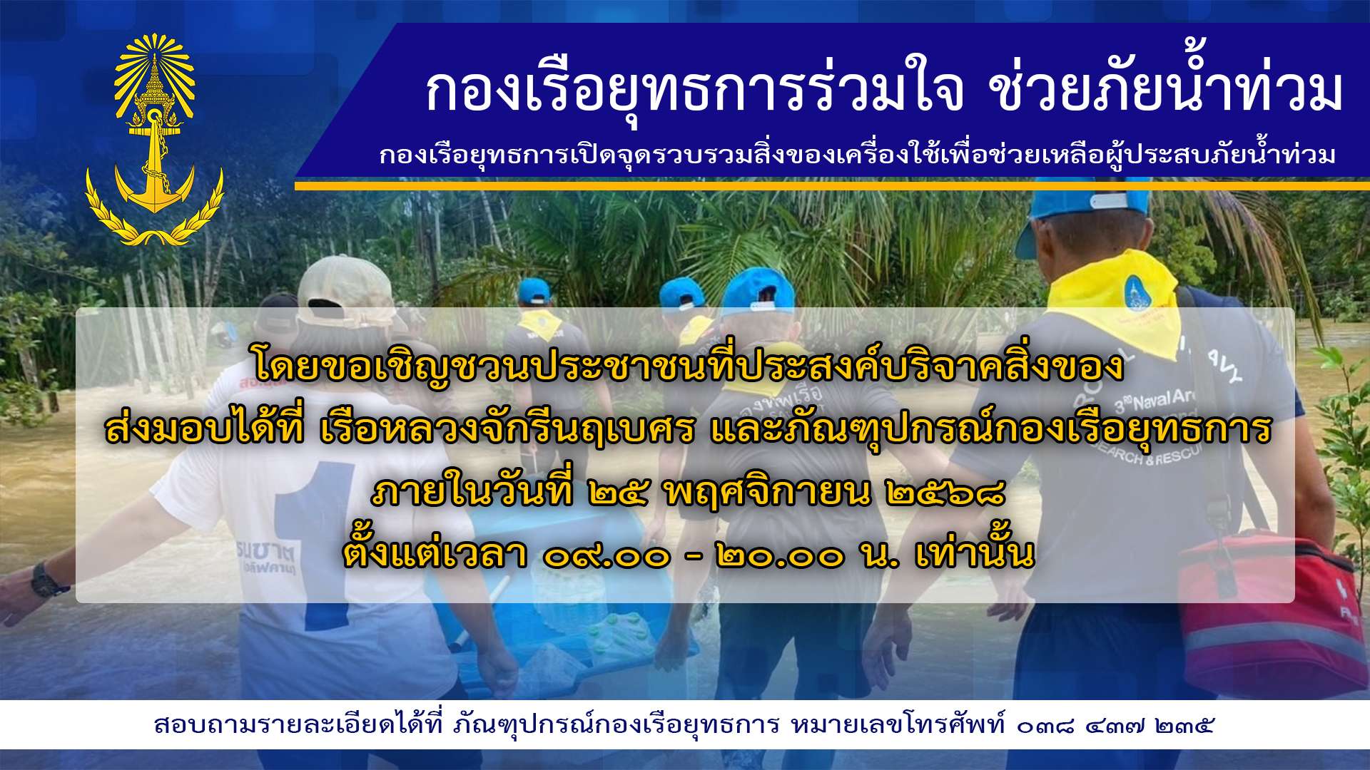 กองเรือยุทธการ ขอเชิญชวนกำลังพลและประชาชนผู้มีจิตศรัทธา ร่วมบริจาคสิ่งของจำเป็นเพื่อช่วยเหลือพี่น้องประชาชนในภาคใต้ ที่ได้รับผลกระทบจากสถานการณ์อุทกภัย โดยกองเรือยุทธการได้เปิดจุดรวบรวมสิ่งของ ณ เรือหลวงจักรีนฤเบศร และภัณฑุปกรณ์ กองเรือยุทธการ ภายในวันที่ 25 พฤศจิกายน 2568 ตั้งแต่เวลา 09.00 น. ถึง 20.00 น. เท่านั้น