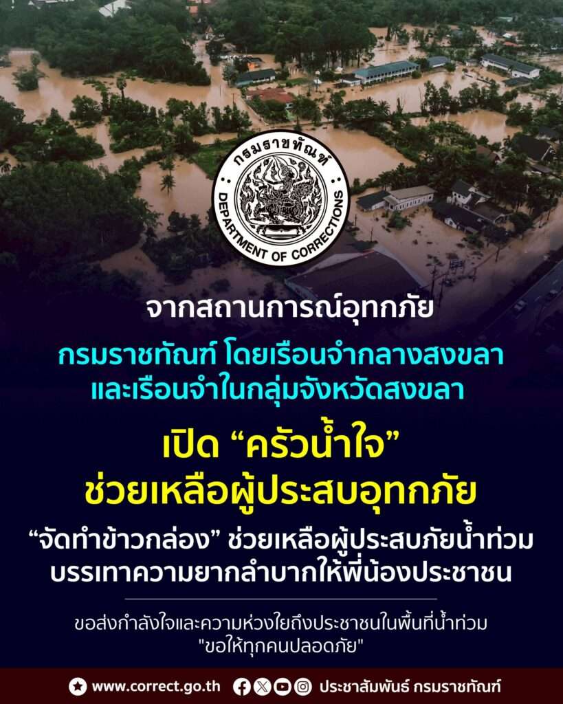 25 พ.ย.68 จากสถานการน้ำท่วมภาคใต้กรมราชทัณฑ์ โดยเรือนจำกลางสงขลา และเรือนจำในกลุ่มจังหวัดสงขลา ร่วมระดมความช่วยเหลือประชาชนที่ได้รับผลกระทบจากสถานการณ์อุทกภัยในหลายพื้นที่ของจังหวัดสงขลา เปิด “ครัวน้ำใจ” เพื่อจัดทำอาหารปรุงสุกที่สะอาด ถูกสุขลักษณะ และได้มาตรฐาน ภายใต้การดูแลของเจ้าหน้าที่และผู้ต้องขังที่ผ่านการฝึกอบรมด้านโภชนาการ เพื่อจัดส่ง “ข้าวกล่องช่วยเหลือผู้ประสบภัยน้ำท่วม” มอบให้ประชาชนในพื้นที่ที่ได้รับผลกระทบโดยตรง ซึ่งขณะนี้มีประชาชนจำนวนมากประสบความเดือดร้อนและต้องการการสนับสนุนอย่างเร่งด่วนการดำเนินงานครั้งนี้มีเป้าหมายเพื่อบรรเทาความยากลำบากของพี่น้องประชาชน ลดภาระในภาวะวิกฤต และเป็นกำลังใจให้ผู้ประสบภัยสามารถก้าวผ่านสถานการณ์ยากลำบากไปได้ โดยกรมราชทัณฑ์ยังคงเดินหน้าประสานความร่วมมือกับหน่วยงานท้องถิ่นและภาคีเครือข่ายเพื่อให้การช่วยเหลือเป็นไปอย่างรวดเร็วและทั่วถึง