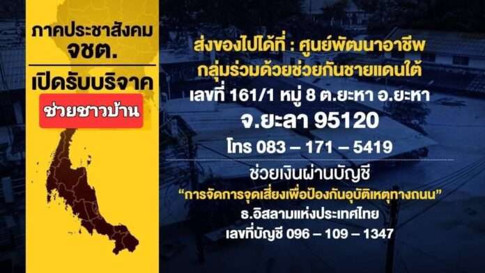 สมาคมสื่อมวลชนเพื่อพัฒนาชายแดนภาคใต้จึงขอเชิญชวนผู้มีจิตศรัทธาร่วมเป็นส่วนหนึ่งของ “ครัวสร้างสุข” เพื่อบรรเทาความเดือดร้อนของผู้ประสบภัยในครั้งนี้ และสามารถสมทบทุนเพื่อช่วยเหลือผู้ประสบภัยได้ที่  ธนาคาร อิสลามแห่งประเทศไทย ชื่อบัญชี : กลุ่มการจัดการจุดเสี่ยงเพื่อป้องกันอุบัติเหตุทางถนน เลขที่บัญชี: 096-109-1347 หรือบริจาคสิ่งของ วัตถุดิบ และของใช้อื่น ๆ ได้ที่จุดรับบริจาค 2 แห่ง ดังนี้ ศูนย์พัฒนาอาชีพ กลุ่มร่วมด้วยช่วยกันชายแดนใต้ ที่อยู่ เลขที่ 161/1 หมู่ 8 ตำบลยะหา อำเภอยะหา จังหวัดยะลา 95120 และ ที่ สมาคมสื่อมวลชนเพื่อพัฒนาจังหวัดชายแดนภาคใต้ ที่อยู่: 181/19 ซ.เพชรสุภา ตำบลจะบังติกอ อำเภอเมือง จังหวัดปัตตานี 94000  สอบถามข้อมูลเพิ่มเติม และติดตามการช่วยเหลือได้ที่ 083-881-2531, 081-789-6959 ,083-171-5419