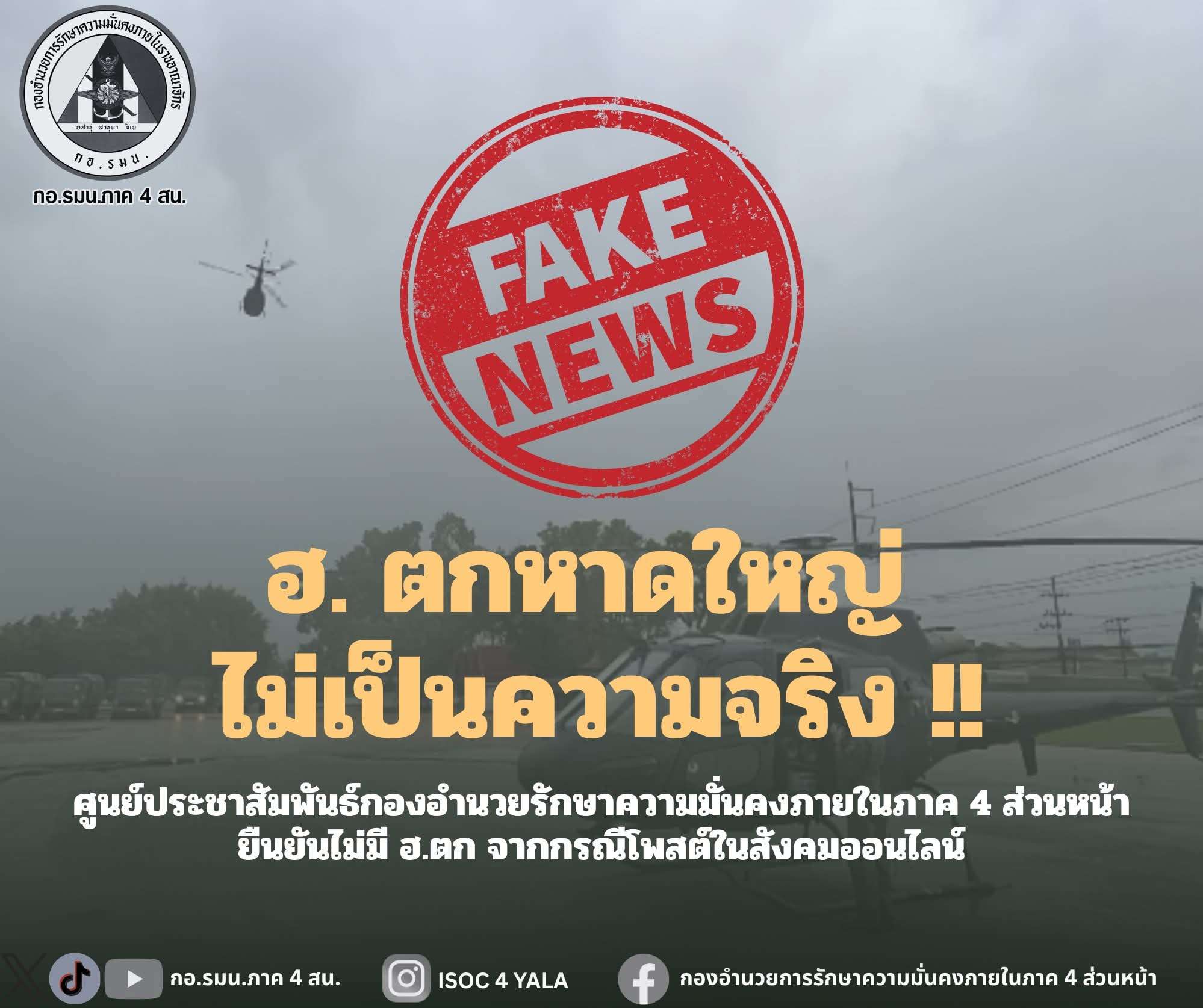 ศูนย์ประชาสัมพันธ์ กองอำนวยรักษาความมั่นคงภายในภาค 4 ส่วนหน้า ยืนยันไม่มี ฮ.ตก จากกรณีโพสต์ในสังคมออนไลน์ ที่มีการแชร์ข่าว เฮลิคอปเตอร์ของเจ้าหน้าที่ตก ขณะออกช่วยเหลือพี่น้องประชาชนที่ประสบอุทกภัยในอำเภอหาดใหญ่นั้น ไม่เป็นความจริง ขอความร่วมมือพี่น้องประชาชนงดแชร์ข้อมูลไม่เป็นความจริง หรือข้อมูลที่บิดเบือน หากมีข้อมูลที่สงสัยสามารถสอบถามได้ทางเพจ กองอำนวยการรักษาความมั่นคงภายในภาค 4 ส่วนหน้า
