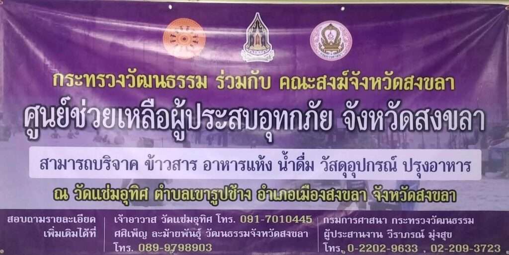 สอบถามข้อมูล – ประสานงานจุดบริจาค – วัดแช่มอุทิศ 091-701-0445 – สำนักงานวัฒนธรรมจังหวัดสงขลา 089-979-8903, 084-353-4981 – กรมการศาสนา 0 2202 9633, 087-018-1911
