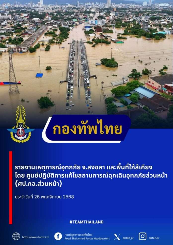 เมื่อวันที่ 26 พ.ย.68 ศูนย์ปฏิบัติการแก้ไขสถานการณ์ฉุกเฉินอุทกภัยส่วนหน้า (ศป.กฉ.สน.) ดำเนินภารกิจช่วยเหลือประชาชนผู้ประสบอุทกภัย ในพื้นที่ภาคใต้อย่างเข้มข้นตลอดทั้งวัน โดยมุ่งเน้นภารกิจกู้ภัยฉุกเฉิน อพยพ และการแพทย์ทหารในพื้นที่ที่ได้รับผลกระทบหนักที่สุด