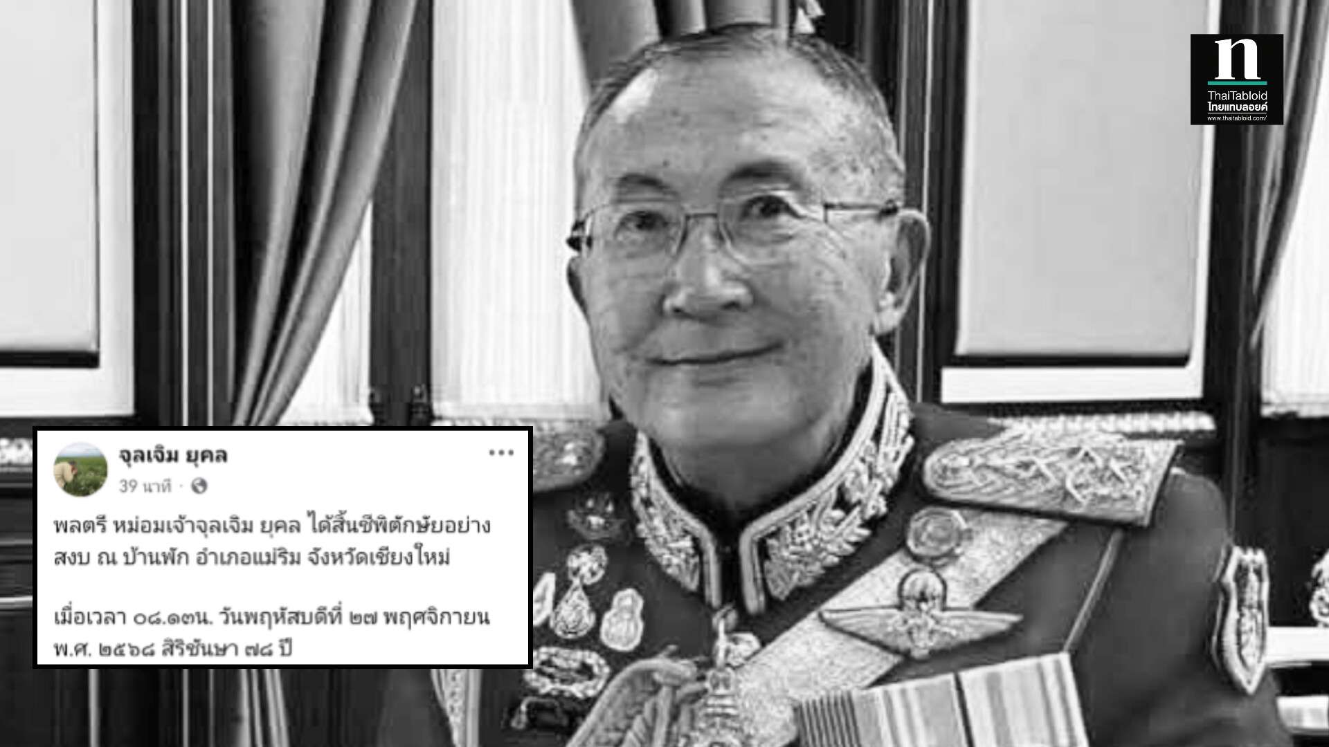 เฟซบุ๊ก “จุลเจิม ยุคล” แจ้งข่าวเศร้า “ท่านชายใหม่” สิ้นชีพิตักษัยอย่างสงบ ณ บ้านพักที่แม่ริม จ.เชียงใหม่ ขณะประชาชนและผู้ใกล้ชิดร่วมแสดงความอาลัยต่อรัชทายาทโดยสันนิษฐาน ลำดับที่ 6 แห่งราชสกุลยุคล
