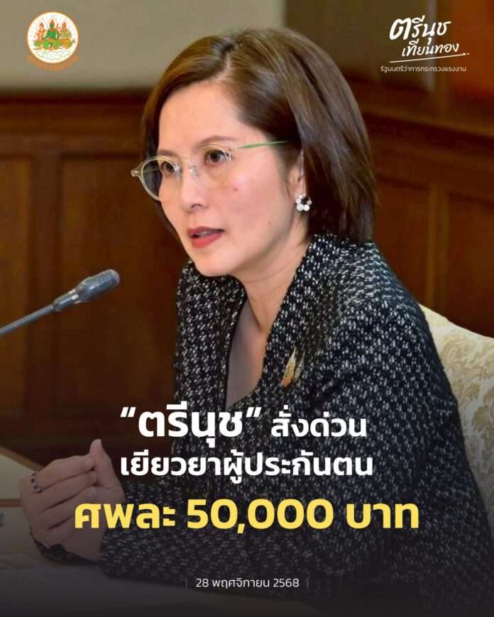 วันที่ 28 พฤศจิกายน 2568 นางสาวตรีนุช เทียนทอง รัฐมนตรีว่าการกระทรวงแรงงาน ให้สัมภาษณ์ความคืบหน้าการเยียวยาผู้ประกันตนที่ได้รับผลกระทบจากสถานการณ์อุทกภัยในพื้นที่ภาคใต้ ว่า ได้สั่งการให้สำนักงานประกันสังคมเร่งดำเนินการดูแลสิทธิประโยชน์ต่าง ๆ ของผู้ประกันตนที่ต้องได้รับ ทั้งผู้ประกันตนมาตรา 33 และ มาตรา 39 , 40