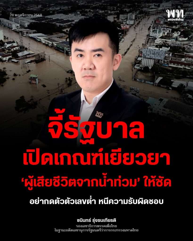 นายชนินทร์ รุ่งธนเกียรติ รองเลขาธิการพรรคเพื่อไทย ในฐานะอดีตเลขานุการรัฐมนตรีว่าการกระทรวงมหาดไทย โพสต์ข้อความในเฟซบุ๊กส่วนตัวว่า รัฐบาลแถลงยืนยันผู้เสียชีวิต 85 ราย เป็นผู้เสียชีวิตจากน้ำท่วมแค่ 55 ราย โดยจะเยียวยาศพละ 2 ล้านบาท ตนอยากให้รัฐบาลแถลงหลักเกณฑ์ให้ชัดเจนกว่านี้ เพื่อสร้างความสบายใจให้ครอบครัวผู้ประสบเหตุ อย่าปล่อยให้ประชาชนอยู่ในความกังวล