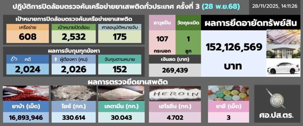 ทั้งนี้ ระหว่างวันที่ 15 – 28 พฤศจิกายน 2568 ได้ปิดล้อมตรวจค้นเป้าหมายยาเสพติดรวมทั้งสิ้น 5,173 จุด 1,261 เครือข่ายยาเสพติด จับกุมผู้ต้องหา 7,667 ราย ตรวจยึดยาเสพติด แบ่งเป็น ยาบ้า 43,724,077 เม็ด, ไอซ์ 2,089.512 กิโลกรัม, เคตามีน 37.045 กิโลกรัม, เฮโรอีน 13.640 กิโลกรัม, ยาอี 199 เม็ด พร้อมทั้งตรวจยึดอาวุธปืน 203 กระบอก, วัตถุระเบิด 1 ลูก, เงินสด 1,157,800 บาท ผลการอายัดทรัพย์สินรวม 270,955,620 บาท