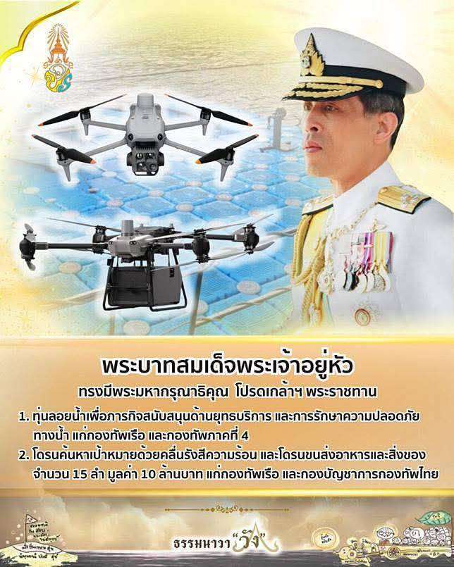 ตามหนังสือจากหน่วยราชการในพระองค์ ๙๐๔ ลงวันที่ 29 พฤศจิกายน 2568 พลอากาศเอก สถิตย์พงษ์ สุขวิมล ราชเลขานุการในพระองค์ฯ ได้แจ้งพระราชกระแสถึงผู้บัญชาการทหารเรือว่า พระบาทสมเด็จพระเจ้าอยู่หัว ทรงพระกรุณาโปรดเกล้าฯ พระราชทาน อากาศยานไร้คนขับ (Drone) สำหรับภารกิจค้นหา และ โดรนสำหรับขนส่งอาหาร ให้กองทัพเรือใช้สนับสนุนการบรรเทาอุทกภัยในพื้นที่ภาคใต้ ตลอดจนช่วยเหลือประชาชนในภาวะสาธารณภัย