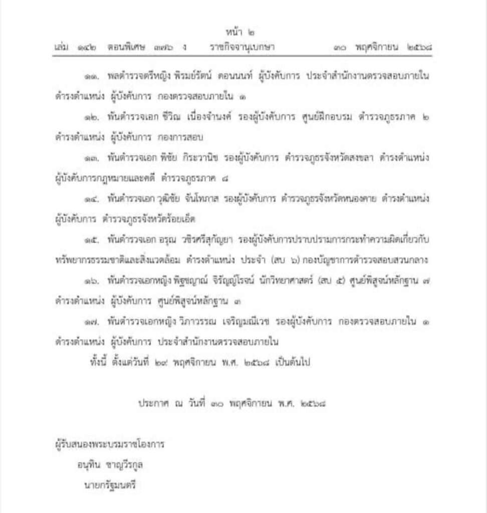 วันที่ 1 ธ.ค. 2568 เว็บไซต์ราชกิจจานุเบกษา เผยแพร่ประกาศสำนักนายกรัฐมนตรี เรื่อง แต่งตั้งข้าราชการตำรวจ ระบุว่า มีพระบรมราชโองการโปรดเกล้าโปรดกระหม่อมแต่งตั้งข้าราชการตำรวจ ให้ดำรงตำแหน่งต่าง ๆ จำนวน 17 ราย ดังนี้