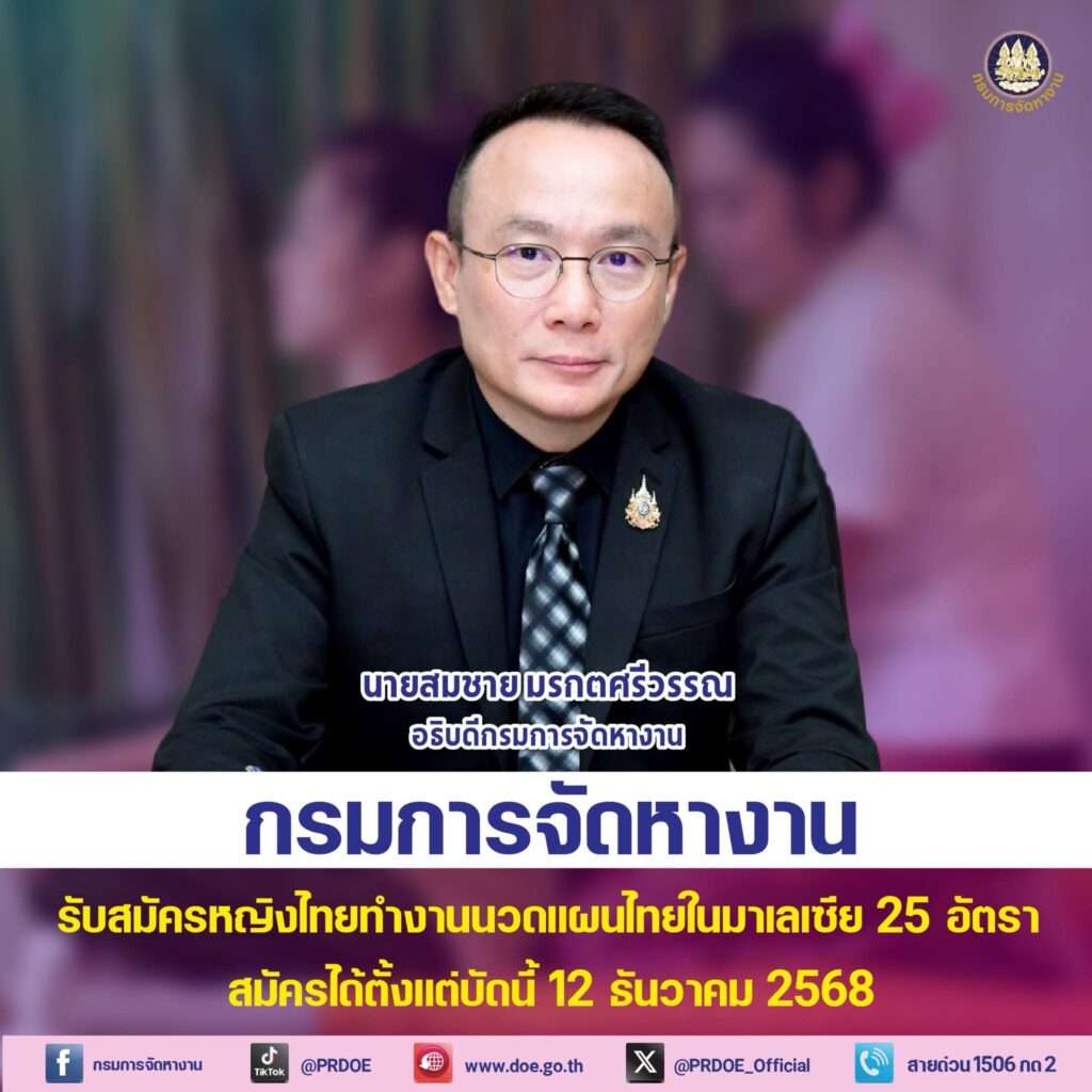 ข่าวดี! กรมการจัดหางาน รับสมัครหญิงไทยไปนวดแผนไทยในมาเลเซีย 25 อัตรา หนุน“คนไทยต้องมีงานทำ”