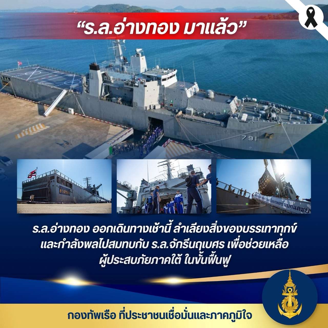 เรือโทหญิง นภัสกร ทิพย์โส ผู้ช่วยโฆษกกองทัพเรือ รายงานว่า กองทัพเรือได้จัดส่ง เรือหลวงอ่างทอง ออกปฏิบัติภารกิจลำเลียงสิ่งของบรรเทาทุกข์และสนับสนุนการฟื้นฟูพื้นที่ภาคใต้ที่ได้รับผลกระทบรุนแรง โดยถือเป็นการเข้าสู่ ระยะฟื้นฟู เพื่อเร่งคืนความเป็นปกติให้ประชาชน