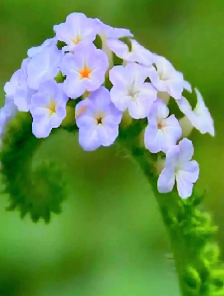 จุดโดดเด่นที่สุด คือ ช่อดอกยาวโค้ง ที่ค่อย ๆ ม้วนงอขึ้นด้านบน ดอกย่อยเล็กสีขาวหรือม่วงอมชมพู บานเรียงเป็นสองแถวจากโคนไปหาปลายช่อ ราวกับลำแสงค่อย ๆ ก่อตัวขึ้นเมื่อไต่สายตาไปตามแนวโค้ง ผลของพืชชนิดนี้เป็นผลแห้ง แตกออกเป็นสองซีก แต่ละซีกมีเมล็ดเล็ก ๆ พร้อมกระจายพันธุ์ไปตามกระแสลม