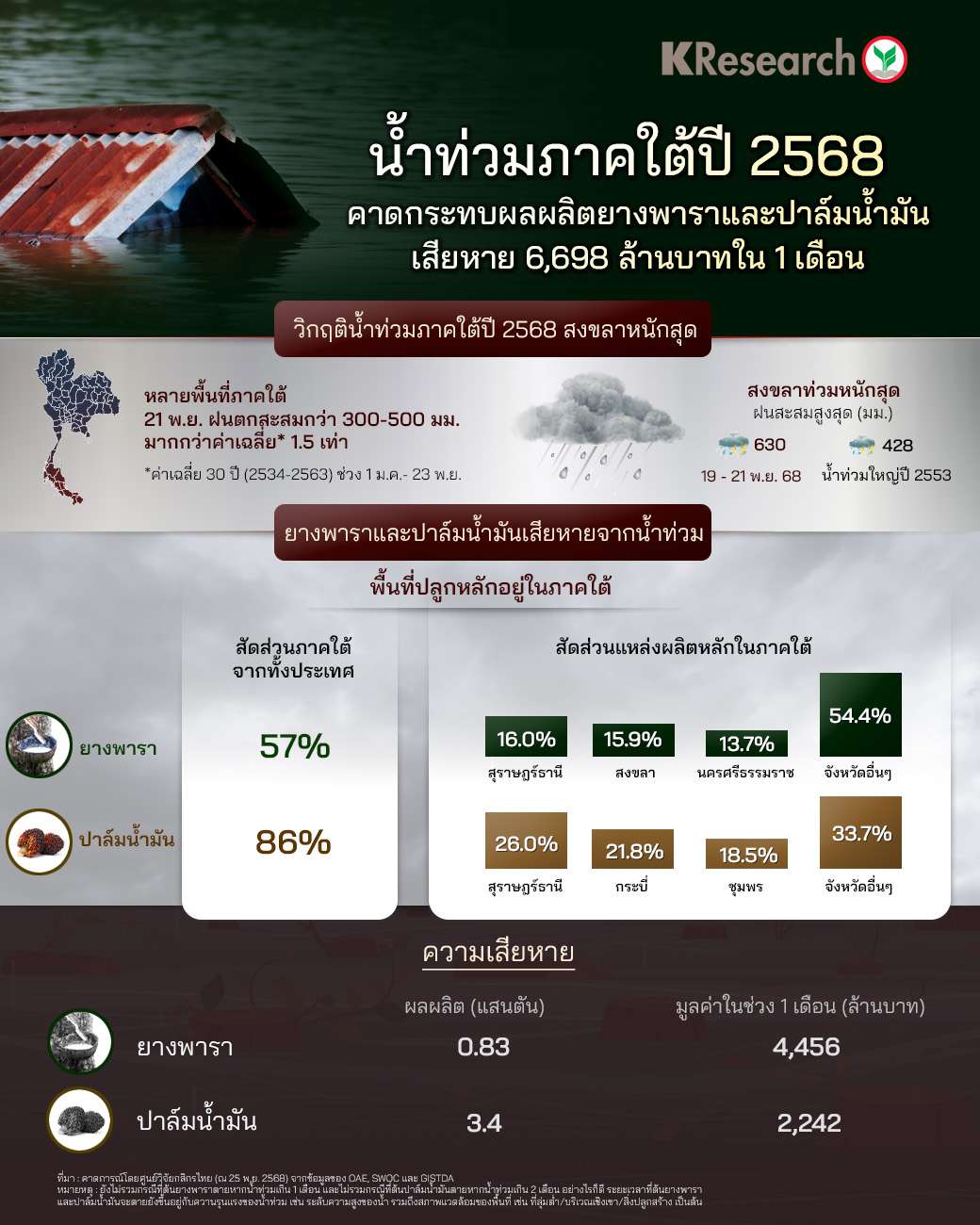 ศูนย์วิจัยกสิกรไทย ประเมินว่า ความเสียหายของผลผลิตยางพาราและปาล์มน้ำมันจากน้ำท่วม คิดเป็นมูลค่ารวม 6,698 ล้านบาท แบ่งเป็นความเสียหายของผลผลิตยางพารา 0.83 แสนตัน คิดเป็นมูลค่า 4,456 ล้านบาท และความเสียหายของผลผลิตปาล์มน้ำมัน 3.4 แสนตัน คิดเป็นมูลค่า 2,242 ล้านบาท