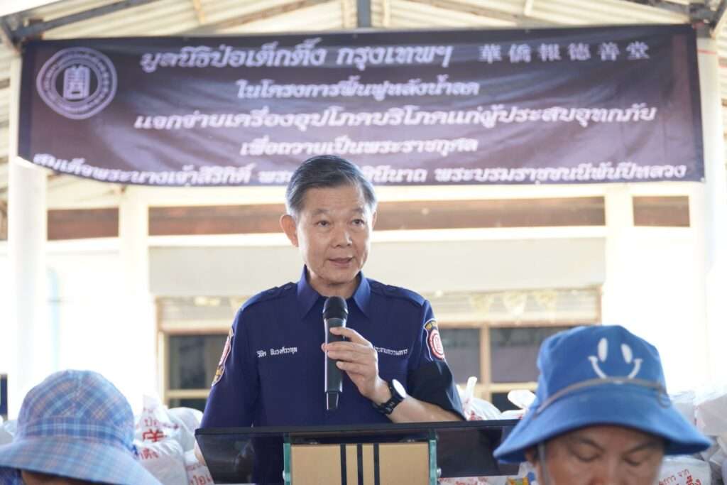โดยมี นายชาติชาตรี ธรรมโหร ปลัดองค์การบริหารส่วนตำบลบางตาเถร ร่วมในพิธี พร้อมด้วย ดร.ปภัสรา เตชะไพบูลย์ อาสาสมัครกิตติมศักดิ์มูลนิธิป่อเต็กตึ๊ง ร่วมลงพื้นที่แจกจ่ายและให้กำลังใจแก่ผู้ประสบภัย ณ องค์การบริหารส่วนตำบลบางตาเถร อำเภอสองพี่น้อง จังหวัดสุพรรณบุรี