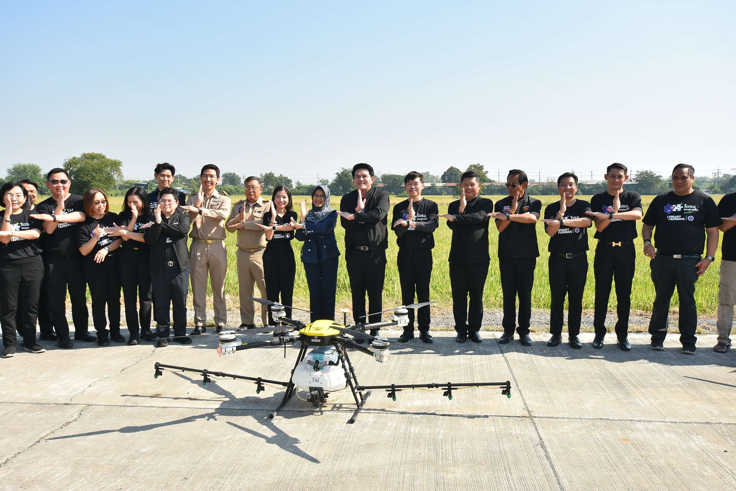 วันที่ 2 ธ.ค. 2568 นายสุรศักดิ์ พันธ์เจริญวรกุล รมว.การอุดมศึกษา วิทยาศาสตร์ วิจัยและนวัตกรรม (อว.) ลงพื้นที่องค์การบริหารส่วนตำบลกระจิว (อบต.กระจิว) อ.ภาชี จ.พระนครศรีอยุธยา เพื่อคิกออฟโครงการ “โดรนคนละครึ่งพลัส สู่สมาร์ทฟาร์มมิ่ง” โดยมี พญ.เพชรดาว โต๊ะมีนา ผู้ช่วย รมว.อว., นายพิษณุ พลธี ที่ปรึกษา รมว.อว., น.ส.พิมพ์พร ชีวานันท์ เลขานุการ รมว.อว., น.ส.วราภรณ์ รุ่งตระการ รองปลัดอว., ดร.วันนี นนท์ศิริ หัวหน้าผู้ตรวจราชการ อว., ดร.พันธ์เพิ่มศักดิ์ อารุณี ผู้ช่วยปลัด อว., ผู้บริหารหน่วยงานกระทรวง อว., นายวรวิทย์ ยอแสง รองผู้ว่าราชการจังหวัดพระนครศรีอยุธยา, นายฉลอง ขุนพรหม นายก อบต.กระจิว ผู้บริหารหน่วยงานในพื้นที่ และเกษตรกรในพื้นที่กว่า 300 คนเข้าร่วม นอกจากนี้ ยังมี น.ส.พิมพฤดา ตันจรารักษ์ ส.ส.เขต 3 จังหวัดพระนครศรีอยุธา พรรคภูมิใจไทยเข้าร่วมด้วย