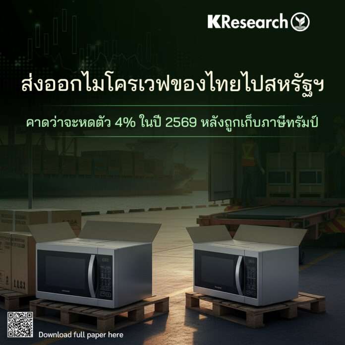 กรุงเทพฯ, วันที่ 2 ธ.ค. – ศูนย์วิจัยกสิกรไทย รายงานว่า ในช่วง 5 ปีที่ผ่านมา ก่อนสหรัฐฯ ขึ้นภาษีนำเข้า มีแนวโน้มการนำเข้าไมโครเวฟจากมาเลเซียลดลง ขณะที่การส่งออกไมโครเวฟจากไทยไปยังสหรัฐฯ ขยายตัวเล็กน้อย เนื่องจากราคานำเข้าเฉลี่ยจากไทยลดลง ในขณะเดียวกัน ราคานำเข้าจากมาเลเซียกลับปรับตัวสูงขึ้น อย่างไรก็ตาม คาดว่าหลังจากภาษีทรัมป์มีผลบังคับใช้ มูลค่าการส่งออกไมโครเวฟของไทยไปยังสหรัฐฯ ในปี 2569 จะหดตัวราว 4% ตลอดทั้งปี