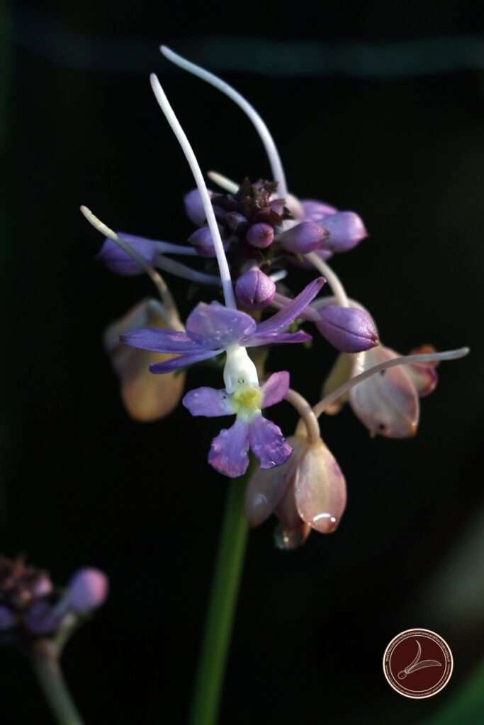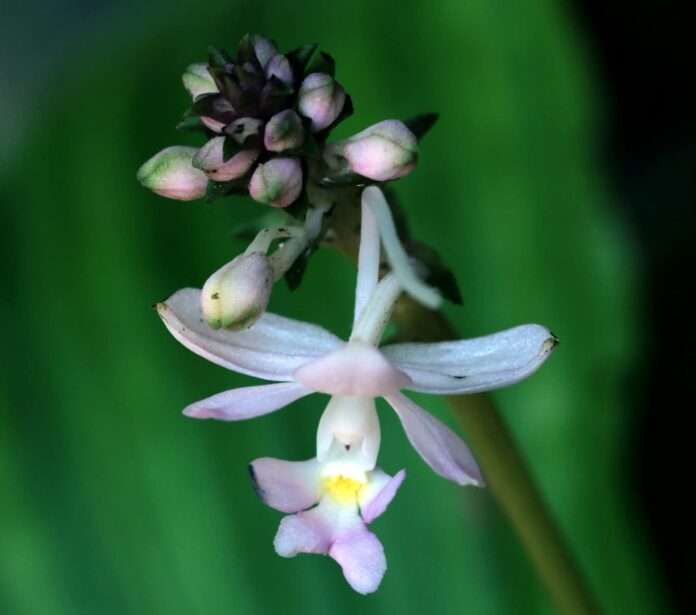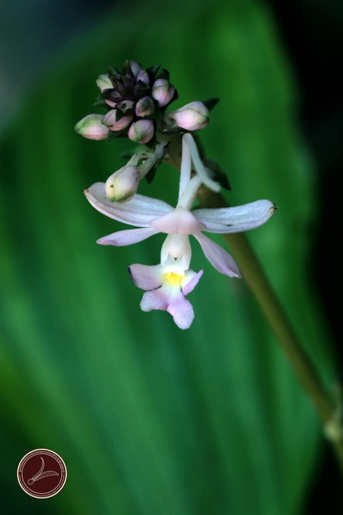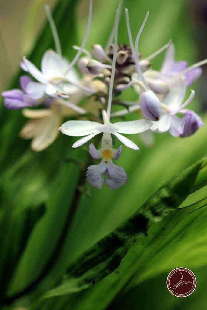เสน่ห์ของกล้วยไม้ชนิดนี้อยู่ที่สีของดอก—เมื่อแรกบานจะเป็นสีม่วงหรือสีขาว จากนั้นค่อยๆ เปลี่ยนเป็นสีเหลืองเมื่อแก่ กลีบดอกมีขนาดเส้นผ่านศูนย์กลางราว 20–30 มิลลิเมตร รูปแบบของกลีบและเดือยดอกถูกออกแบบโดยธรรมชาติให้เหมาะสมต่อการผสมเกสรอย่างงดงาม ดึงดูดนักพฤกษศาสตร์และนักอนุรักษ์มานักต่อนัก