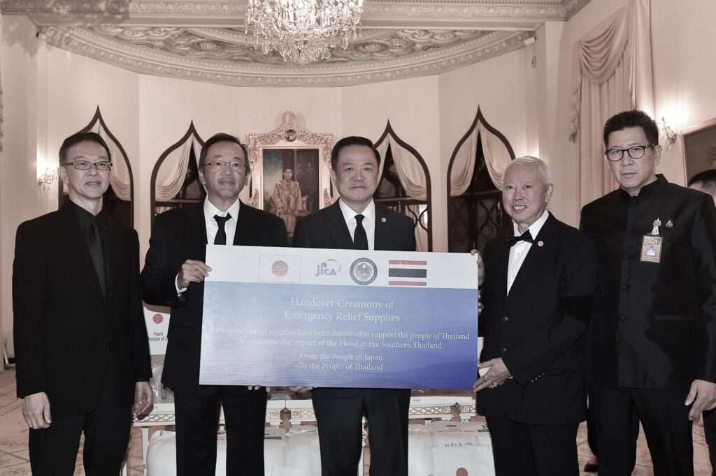 ด้านเอกอัครราชทูตญี่ปุ่นกล่าวว่า ทั้งสองประเทศต่างยืนหยัดเคียงข้างกันเสมอในยามที่ต้องเผชิญความยากลำบาก ความช่วยเหลือครั้งนี้จึงตั้งอยู่บนพื้นฐานของมิตรภาพและความเป็นน้ำหนึ่งใจเดียวกันที่มั่นคงระหว่างสองประเทศ และยังสะท้อนถึงความรู้สึกตอบแทนน้ำใจที่ประชาชนชาวญี่ปุ่นมีต่อความช่วยเหลืออันอบอุ่นที่ประเทศไทยได้มอบให้แก่ญี่ปุ่นในยามที่ประสบความยากลำบากเมื่อในอดีตที่ผ่านมา จึงหวังเป็นอย่างยิ่งว่าสิ่งของบรรเทาทุกข์เหล่านี้จะช่วยบรรเทาความเดือดร้อนของผู้ประสบภัย พร้อมขอให้ประชาชนปลอดภัยและฟื้นตัวจากเหตุการณ์อุทกภัยในครั้งนี้ได้ในเร็ววัน โดยประเทศญี่ปุ่นจะขอยืนเคียงข้างชาวไทยทุกท่านเสมอ