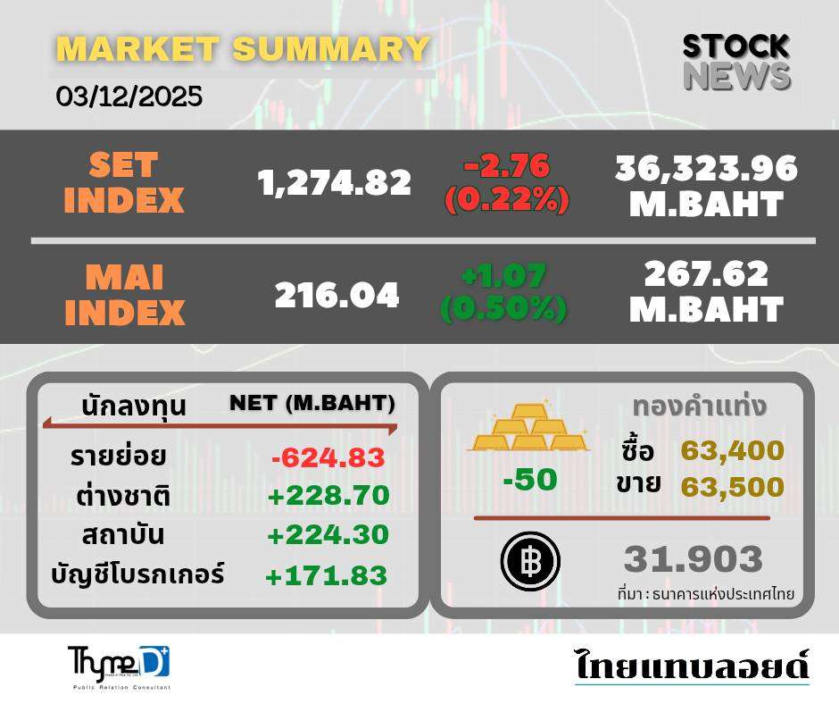 SET ปิดวันนี้ที่ 1,274.82 จุด ลดลง 2.76 จุด (-0.22%) มูลค่าซื้อขาย 36,323.96 ล้านบาท
