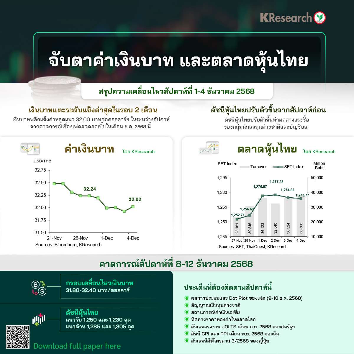 โดยสัปดาห์หน้า (8 – 12 ธ.ค.) ศูนย์วิจัยกสิกรคาดกรอบการเคลื่อนไหวของเงินบาทที่ 31.80 – 32.40 บาท/ดอลลาร์ฯ ส่วนดัชนีหุ้นไทย แนวรับที่ 1,250 และ 1,230 จุด แนวต้าน 1,285 และ 1,305 จุด