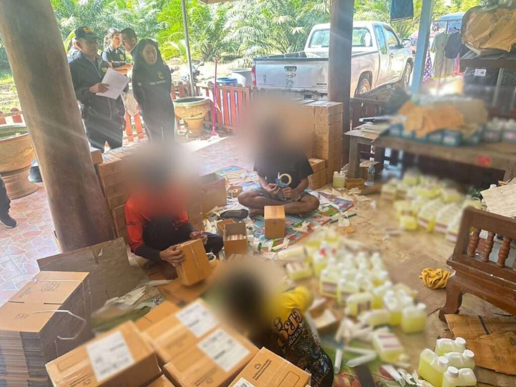 เมื่อเข้าตรวจค้นบ้านหลังหนึ่งซึ่งถูกใช้เป็นสถานที่ผลิต เจ้าหน้าที่พบเครื่องมือและอุปกรณ์ครบชุด ทั้งถังผสมสารเคมี โต๊ะบรรจุ และวัตถุดิบเคมีหลายชนิด รวมถึงฉลากเลียนแบบแบรนด์ดังในตลาด โดยภายในบ้านมีปุ๋ยยูเรียปลอมและสารกำจัดแมลงปลอมจำนวนมาก รวมมูลค่ากว่า 2 แสนบาท พร้อมเตรียมส่งขายให้เกษตรกรทั่วประเทศผ่านช่องทางออนไลน์