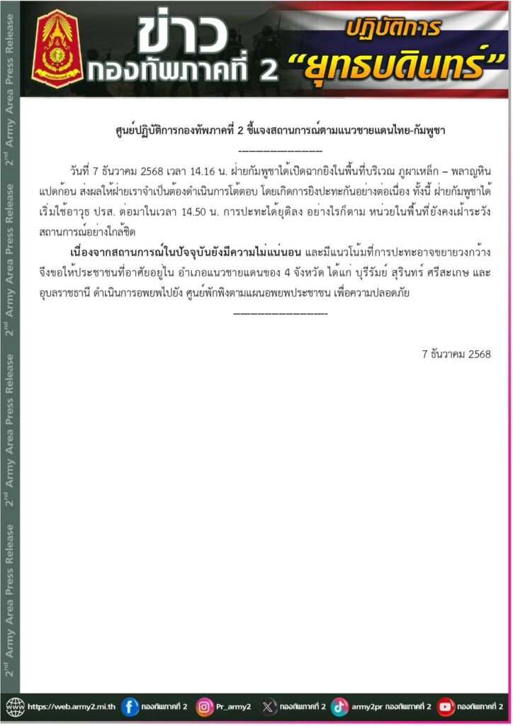วันที่ 7 ธันวาคม 2568 เวลา 14.16 น. ฝ่ายกัมพูชาได้เปิดฉากยิงในพื้นที่บริเวณ ภูผาเหล็ก – พลาญหินแปดก้อน ส่งผลให้ฝ่ายเราจำเป็นต้องดำเนินการโต้ตอบ โดยเกิดการยิงปะทะกันอย่างต่อเนื่อง ทั้งนี้ ฝ่ายกัมพูชาได้เริ่มใช้อาวุธ ปรส. ต่อมาในเวลา 14.50 น. การปะทะได้ยุติลง อย่างไรก็ตาม หน่วยในพื้นที่ยังคงเฝ้าระวังสถานการณ์อย่างใกล้ชิด