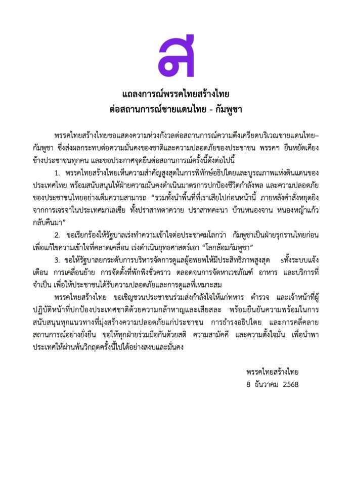 พรรคไทยสร้างไทย ขอแสดงความห่วงกังวลต่อสถานการณ์ความตึงเครียดบริเวณชายแดนไทย–กัมพูชา ซึ่งส่งผลกระทบต่อความมั่นคงของชาติและความปลอดภัยของประชาชน พรรคฯ ยืนหยัดเคียงข้างประชาชนทุกคน และขอประกาศจุดยืนต่อสถานการณ์ครั้งนี้ ดังต่อไปนี้