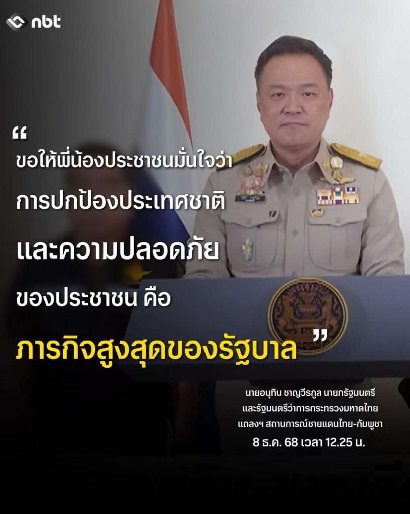 พี่น้องประชาชนชาวไทยที่เคารพ ตั้งแต่วันที่ 7 ธันวาคม 2568 จนถึงขณะนี้ ได้เกิดเหตุการณ์ปะทะตามแนวชายแดนไทย-กัมพูชา ในหลายพื้นที่ ซึ่งเป็นสถานการณ์ที่รัฐบาลติดตามอย่างใกล้ชิดในทุกระยะ และได้สั่งการให้หน่วยงานด้านความมั่นคง บูรณาการการทำงานอย่างเต็มสรรพกำลังเพื่อดูแลความปลอดภัยของพี่น้องประชาชน และปกป้องอธิปไตยของชาติอย่างเคร่งครัด