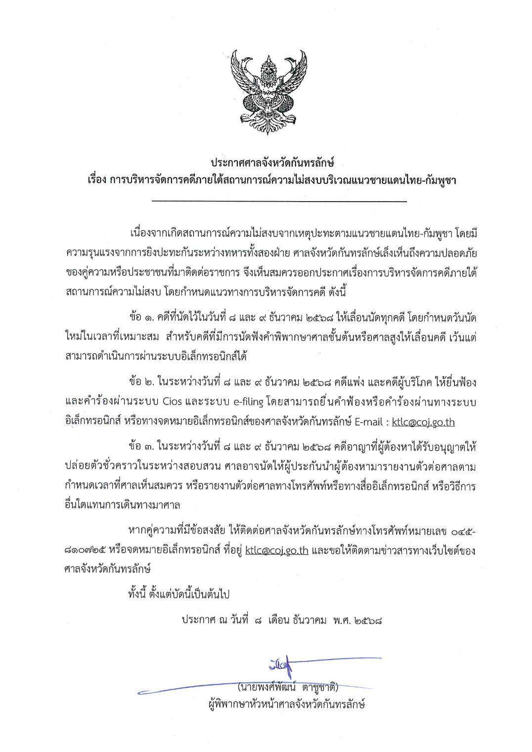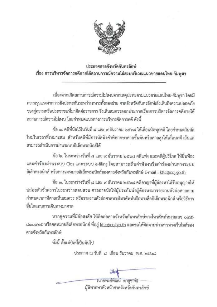 ประกาศศาลจังหวัดกันทรลักษ์ เรื่อง การบริหารจัดการคดีภายใต้สถานการณ์ความไม่สงบบริเวณแนวชายแดนไทย-กัมพูชา เนื่องจากเกิดสถานการณ์ความไม่สงบจากเหตุปะทะตามแนวชายแดนไทย-กัมพูชา โดยมีความรุนแรงจากการยิงปะทะกันระหว่างทหารทั้งสองฝ่าย