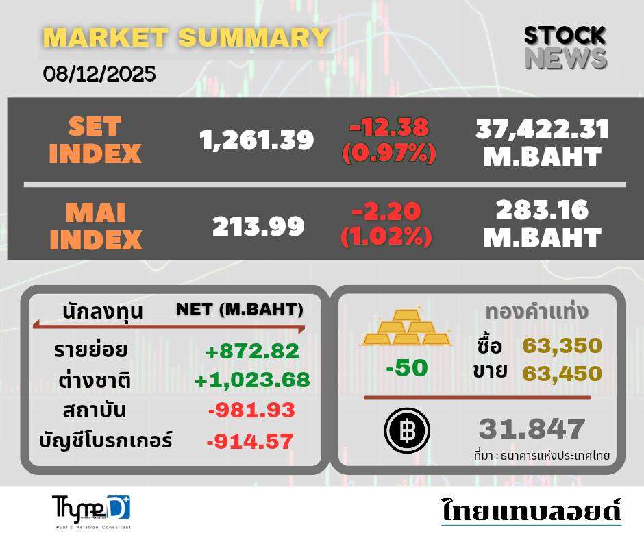 SET ปิดวันนี้ที่ 1,261.39 จุด ลดลง 12.38 จุด (-0.97%) มูลค่าซื้อขาย 37,422.31 ล้านบาท