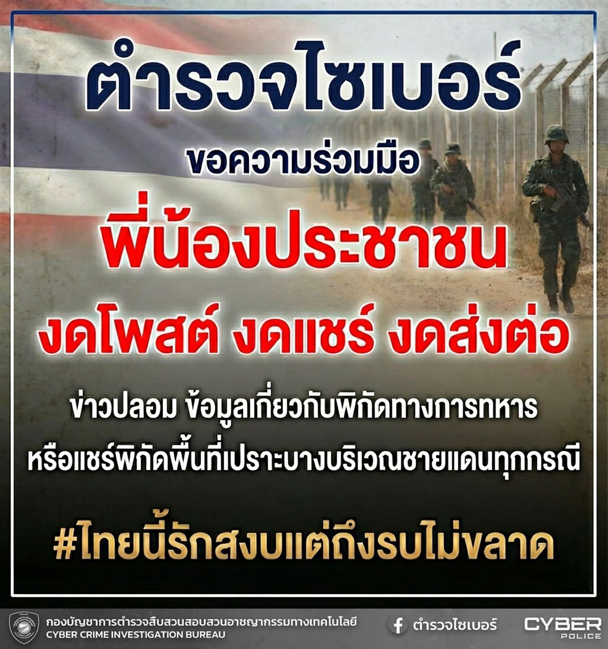 ในช่วงสถานการณ์ที่มีความอ่อนไหวต่อความมั่นคงของประเทศ ขอความร่วมมือพี่น้องประชาชนทุกคน หลีกเลี่ยงการโพสต์ข้อความ ภาพถ่าย คลิปวิดีโอ ระบุพิกัดสถานที่ทางการทหาร หรือการวิเคราะห์สถานการณ์ใด ๆ ที่อาจกระทบกับความมั่นคง ในพื้นที่ชายแดน ไม่ว่าจะเป็นข้อมูลจริง ข่าวลือ หรือความคิดเห็นส่วนตัว