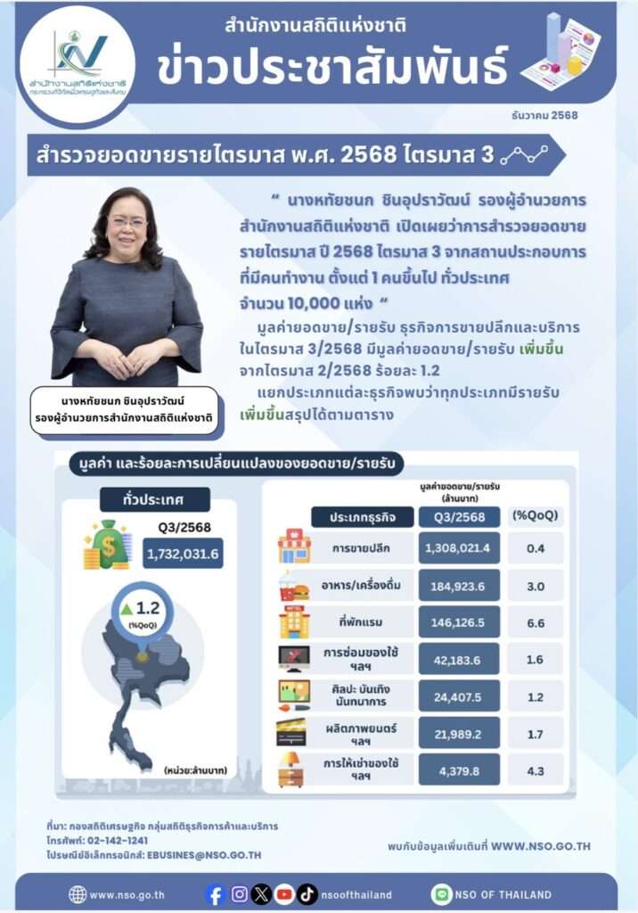 ภาพรวมของธุรกิจการขายปลีกสินค้าและการบริการทั่วประเทศ ในไตรมาส 3 ปี 2568 พบว่า มีมูลค่ารายรับเพิ่มขึ้นจากไตรมาส 2 ปี 2568 (%QoQ) ร้อยละ 1.2 โดยธุรกิจที่พักแรม มีรายรับเพิ่มขึ้นมากที่สุดร้อยละ 6.6 รองลงมาคือ ธุรกิจการให้เช่าของใช้ส่วนบุคคลและของใช้ในครัวเรือน ฯลฯ และธุรกิจการบริการอาหารและเครื่องดื่ม มีรายรับเพิ่มขึ้นร้อยละ 4.3 และร้อยละ 3.0 ตามลำดับ