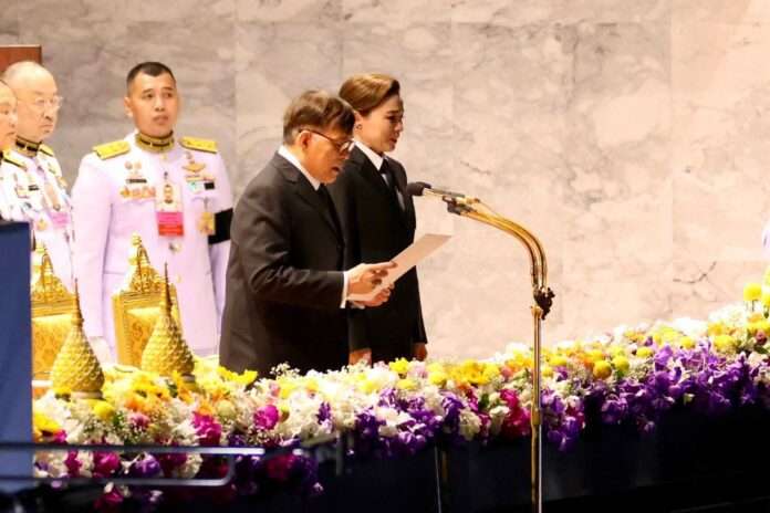 เมื่อเสด็จพระราชดำเนินถึง นายอนุทิน ชาญวีรกุล นายกรัฐมนตรี ประธานคณะกรรมการอำนวยการจัดการแข่งขันกีฬาซีเกมส์ ครั้งที่ 33 ร้อยเอก ธรรมนัส พรหมเผ่า รองนายกรัฐมนตรี ประธานกรรมการการกีฬาแห่งประเทศไทย พร้อมด้วยคณะรัฐมนตรี คณะกรรมการจัดการแข่งขัน ฯ และผู้บริหารการกีฬาแห่งประเทศไทย เฝ้าทูลละอองธุลีพระบาทรับเสด็จ