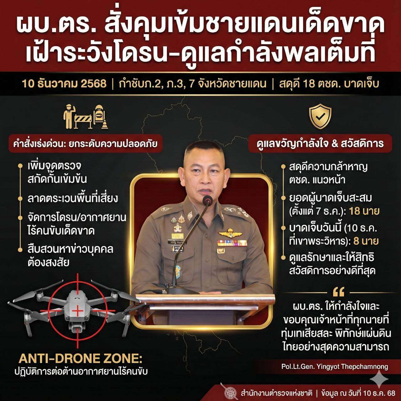วันนี้ (10 ธันวาคม 2568) พล.ต.อ.กิตติ์รัฐ พันธุ์เพ็ชร์ ผู้บัญชาการตำรวจแห่งชาติ (ผบ.ตร.) สั่งการด่วนกำชับ ตำรวจภูธรภาค 2, ตำรวจภูธรภาค 3 และตำรวจภูธรจังหวัด 7 จังหวัดที่มีพื้นที่ติดต่อชายแดนไทย-กัมพูชา ประกอบด้วย ภ.จว.อุบลราชธานี, ภ.จว.ศรีสะเกษ, ภ.จว.สุรินทร์, ภ.จว.บุรีรัมย์, ภ.จว.สระแก้ว, ภ.จว.จันทบุรี และ ภ.จว.ตราด เพิ่มความเข้มในการตั้งจุดตรวจจุดสกัดป้องกันเหตุ และเพิ่มความถี่ในการการตรวจตรา ลาดตระเวนพื้นที่ โดยเฉพาะจุดสำคัญ จุดเสี่ยงต่าง ๆ และให้ตรวจตราเฝ้าระวังและปฏิบัติการต่อต้านการใช้อากาศยานไร้คนขับ หรือ โดรน ในพื้นที่ ตามยุทธวิธีอย่างเด็ดขาด และให้สืบสวนหาข่าวเฝ้าระวังบุคคลต้องสงสัย โดยให้บังคับใช้กฎหมายอย่างเด็ดขาดกับผู้ที่มีพฤติกรรมเป็นภัยต่อความมั่นคง