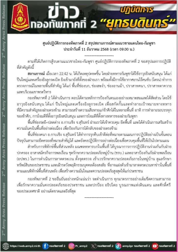 กองทัพภาคที่ 2, วันที่ 11 ธ.ค. – ศูนย์ปฏิบัติการกองทัพภาคที่ 2 ออกแถลงการณ์สรุปผลการปฏิบัติที่สำคัญในการสู้รบตามแนวชายไทย-กัมพูชา ว่า สถานการณ์ ของวันที่ 10 เมื่อเวลา 22.42 น. ได้เกิดเหตุปะทะขึ้น โดยฝ่ายทหารกัมพูชาได้ใช้อาวุธยิงสนับสนุน ได้แก่ ปืนใหญ่และเครื่องยิงลูกระเบิด ยิงเข้ามายังที่ตั้งของทหารไทย พร้อมทั้งมีการใช้อากาศยานไร้คนขับ (โดรน) ทำการตรวจการณ์ในหลายพื้นที่สำคัญ ได้แก่ พื้นที่ช่องบก, ช่องสะงำ, ช่องอานม้า, ปราสาทคนา, ปราสาทตาควาย และบริเวณเขาพระวิหาร
