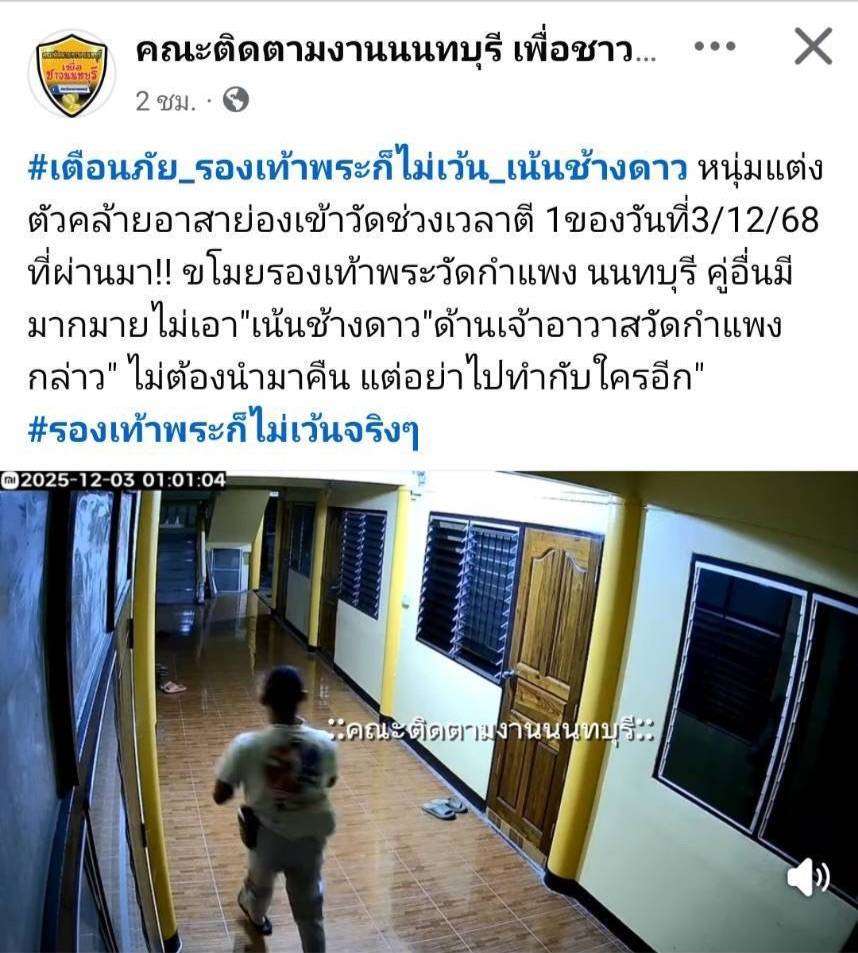 เกิดเหตุภายในวัดกำแพง จ.นนทบุรี เมื่อชายชื่อ “ตูน” ผู้ต้องสงสัยเคยเข้ามาก่อเหตุหลายครั้งก่อนหน้า ล่าสุดช่วงเวลาประมาณตี 01.00 น. ของวันที่ 3 ธ.ค.68 นายตูนเดินย่องขึ้นกุฎิพระ แต่งกายคล้ายเจ้าหน้าที่อาสากู้ภัย ก่อนเลือกหยิบรองเท้าหูหนีบ นันยางตราช้างดาว จากหน้าห้องพระลูกวัดชื่อ “แบงค์” แล้วหลบหนีไป ทั้งที่บริเวณเดียวกันมีรองเท้าแบรนด์อื่นวางอยู่ แต่ไม่แตะต้อง