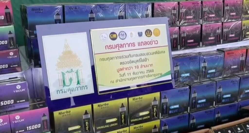 นายพันธ์ทอง ลอยกุลนันท์ อธิบดีกรมศุลกากร เปิดเผยว่า สถิติการจับกุมบุหรี่ไฟฟ้าและอุปกรณ์ในงบประมาณ 2569 (ตั้งแต่วันที่ 1 ตุลาคม – 11 ธันวาคม 2568) สามารถตรวจยึดของกลางได้แล้วกว่า 123,870 ชิ้น รวมมูลค่าสูงถึง 25,170,659 บาท