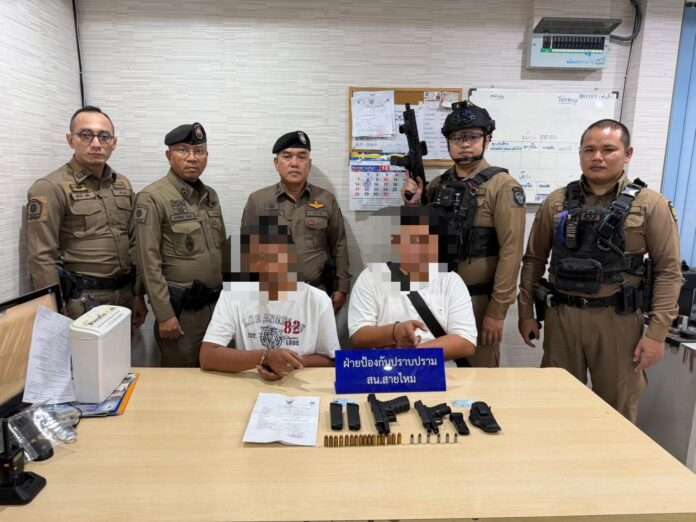 เมื่อเวลา 15.00 น. ( 11 ธ.ค.) พ.ต.อ.ณธัชพงศ์ กิรัมย์ ผกก.สน.สายไหม พร้อมด้วย พ.ต.ท.สัญชัย คีรีรัตน์ รอง ผกก.ป.สน.สายไหม และ พ.ต.ท.ไพศร อู่ข้าวอู่น้ำ สวป.สน.สายไหม สั่งการให้ ร.ต.อ.พงศ์พัฒน์ ภิรมย์ รอง สวป.สน.สายไหม พร้อมด้วยชุด MPB SWAT สายไหม ทำการจับกุมตัวนายชยพัทธ์ อายุ 42 ปี และนายอัษฎายุธ บุญปาน อายุ 43 ปี พร้อมของกลางอาวุธปืน ขนาด 9 มม. จำนวน 1 กระบอก เครื่องกระสุน ขนาด 9 มม. จำนวน 6 นัด อาวุธปืนพกสั้นกึ่งอัตโนมัติ ขนาด .45 ACP จำนวน 1 กระบอก เครื่องกระสุน ขนาด .45 ACP จำนวน 16 นัด โดยจับกุมได้บริเวณ ปากซอยสุขาภิบาล 5 ซอย 17 ใกล้ห้าแยกวัชรพล แขวงท่าแร้ง เขตบางเขน กทม.