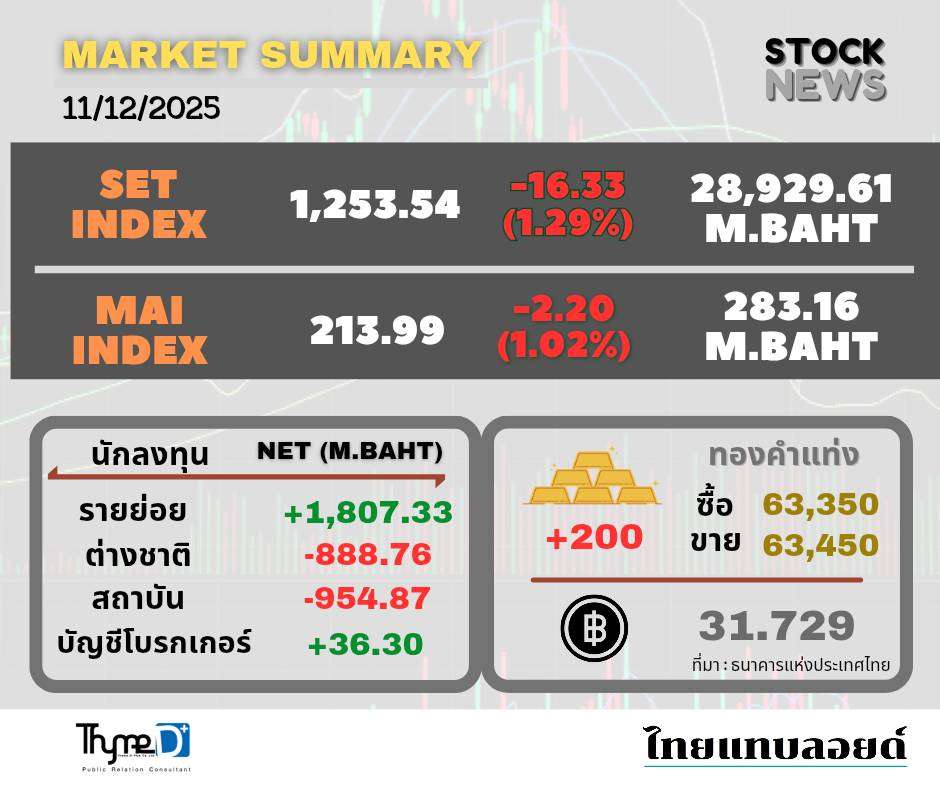 SET ปิดวันนี้ที่ 1,253.54 จุด ลดลง 16.33 จุด (-1.29%) มูลค่าซื้อขาย 28,929.61 ล้านบาท นักวิเคราะห์เผยตลาดหุ้นไทยวันนี้ร่วงจากแรงชายหุ้น DELTA ตอบรับ Sentiment เชิงลบตลาดภูมิภาคส่วนใหญ่ปรับตัวลง รวมทั้งแรงขายทำกำไร AOT นอกจากนี้ TISA ยังไม่มีความชัดเจนทำให้กองทุนที่ซื้อดักปรับพอร์ต แนวโน้มพรุ่งนี้คาดตลาดซึมตัว ลุ้นโอกาสเกิดเทคนิเคิลรีบาวด์แต่ขึ้นจำกัด ให้แนวรับแรก 1,248 จุด ถัดไป 1,240 และ 1,230 จุด แนวต้าน 1,258 และ 1,263 จุด