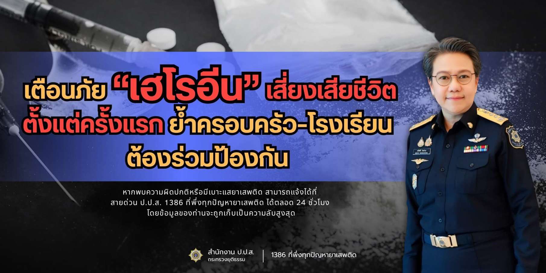 นางสาวอารีภักดิ์ เงินบำรุง รองเลขาธิการ ป.ป.ส. ในฐานะโฆษกสำนักงาน ป.ป.ส. เปิดเผยถึงสถานการณ์ยาเสพติดที่น่าเป็นห่วงในขณะนี้ โดยแจ้งเตือนประชาชนให้เฝ้าระวัง “เฮโรอีน” ยาเสพติดให้โทษประเภท 1 ซึ่งมีฤทธิ์ร้ายแรงและมีความเสี่ยงสูงต่อการเสียชีวิตแม้เสพเพียงครั้งแรก โดยเฉพาะ